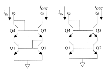 With NPN transistors, the current gain, , is of the order of 100, and, in principle, the mismatch is about 1:5000.