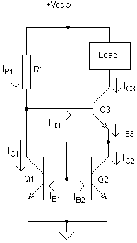 For the Wilson current source of Fig. 2, the input current of the mirror is . The base-emitter voltages, , are typically between 0.5 and 0.75 volts so some authors[1] approximate this result as . The output current is thus substantially dependent only on VCC and R1 and the circuit acts as a constant current source, that is, the current remains constant with variations in the impedance of the load. However, variations in VCC or changes in the value of R1 due to temperature will be reflected in variations in the output current. This method of direct generation of a reference current from the power supply using a resistor rarely has adequate stability for practical applications and more complex circuits are used to provide reference currents independent of temperature and supply voltages.[4]