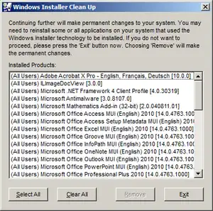 The Windows Installer CleanUp Utility (MSICU.exe, MSICUU.exe, MSICUU2.exe) was a software utility for the Microsoft Windows operating system designed to solve uninstallation problems of programs that use the Windows Installer technology. It looks up registry references and files related to Windows Installer that were installed by various programs, and forcibly wipes invalid entries out. It works in all 32-bit and 64-bit versions of Microsoft Windows.