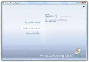 Windows Meeting Space (codenamed Windows Shared View and formerly Windows Collaboration[2][3]) was a peer-to-peer collaboration program developed by Microsoft for Windows Vista as a replacement for Windows NetMeeting[4] and it enables application sharing, collaborative editing, desktop sharing, file sharing, projecting, and simple text-based or ink-based instant messaging across up to 10 users connected to the same network or across the Internet.[5][6][7] Meeting Space has the ability to automatically set up an ad hoc wireless network if a connection to a network or the Internet are not available and also enables participants to invite other people to meeting sessions.[6] It is the first application for the new peer-to-peer framework in Windows Vista and hence requires IPv6.[5]