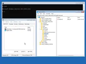 ![]() Windows PE 10.0 (based on Windows 11), showing Windows Command Prompt, Registry Editor and Windows Task Manager | |