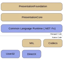 The architecture of WPF spans both managed code and native code components. However, the public API exposed is only available via managed code. While the majority of WPF is in managed code, the composition engine which renders the WPF applications is a native component. It is named Media Integration Layer (MIL) and resides in milcore.dll. It interfaces directly with DirectX and provides basic support for 2D and 3D surfaces, timer-controlled manipulation of contents of a surface with a view to exposing animation constructs at a higher level, and compositing the individual elements of a WPF application into a final 3D "scene" that represents the UI of the application and renders it to the screen.[18][19] The Desktop Window Manager also uses the MIL for desktop and window composition.[20] The media codecs are also implemented in unmanaged code, and are shipped as windowscodecs.dll.[18] In the managed world, PresentationCore (presentationcore.dll) provides a managed wrapper for MIL and implements the core services for WPF,[18] including a property system that is aware of the dependencies between the setters and consumers of the property, a message dispatching system by means of a Dispatcher object to implement a specialized event system and services which can implement a layout system such as measurement for UI elements.[19] PresentationFramework (presentationframework.dll) implements the end-user presentational features, including layouts, time-dependent, story-board based animations, and data binding.[19]