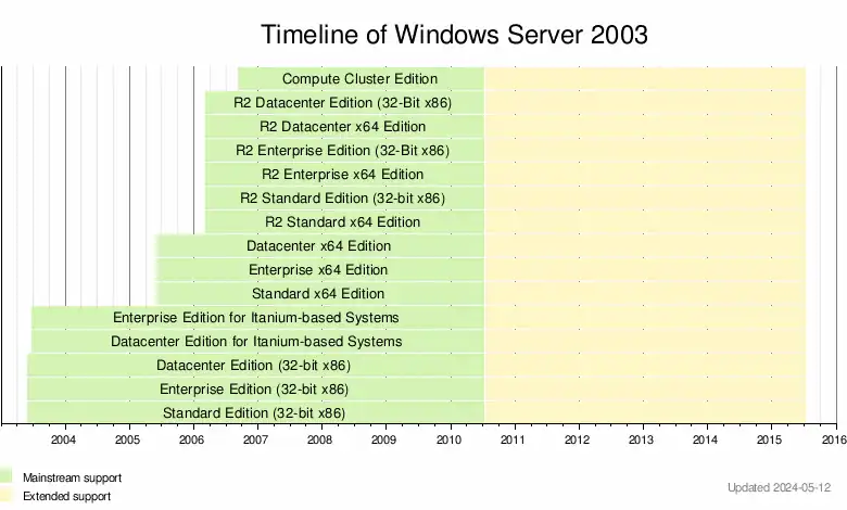 | All editions except Windows Storage Server 2003 and Windows Small Business Server 2003 (including R2): Mainstream support ended on July 13, 2010 Extended support ended on July 14, 2015[7][8][9] Windows Storage Server 2003 (including R2): Mainstream support ended on October 11, 2011 Extended support ended on October 9, 2016[10][11] Windows Small Business Server 2003 (including R2): Mainstream support ended on April 12, 2011 Extended support ended on April 12, 2016[12][13] | |