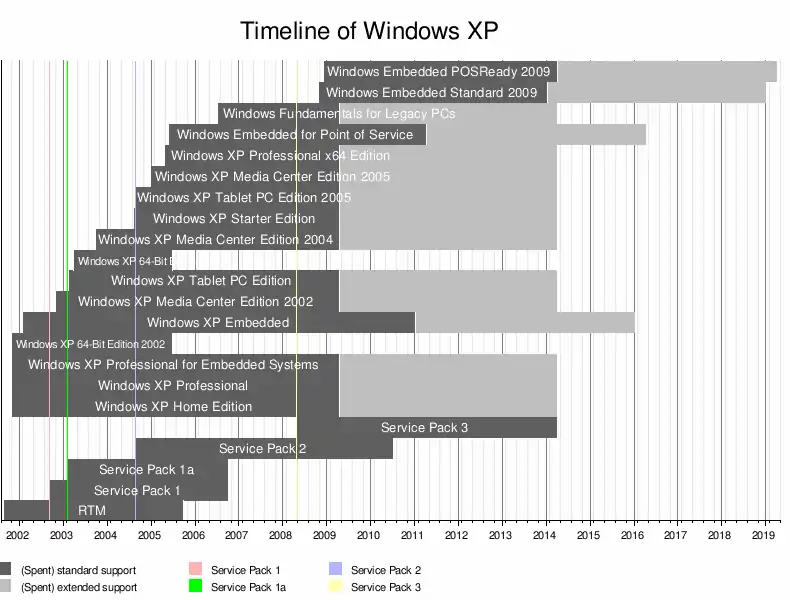 Mainstream support for the main Windows XP ended on April 14, 2009, and extended support ended on April 8, 2014. Windows Embedded POSReady 2009, based on an embedded version of Windows XP Professional, was the last supported version of Windows based on the Windows XP codebase, and received security updates until April 2019. Prior to the main Windows XP's end of support date, unofficial methods were made available to apply the updates to other editions of Windows XP. Microsoft has discouraged this practice, citing compatibility issues. Extended support for Windows Embedded POSReady 2009 ended on April 9, 2019, marking the overall end of the Windows XP codebase after 18 years.[5]