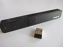 It consists of a transmitter similar to a remote control and a small receiver, usually connected to a USB port on the computer, that detects it as if it were a mouse.[4] Control signals are transmitted by radio (for example 2.4 GHz,[5] Bluetooth[6] ) or in some models by infrared. Usually no additional programs are needed on the computer. Typically does not use any special communication protocol in the presentation program, but instead emulates simple keyboard inputs ( arrow keys, F5 function key, etc..) and some other type of mouse interface (buttons, scroll wheel displacement, etc..).