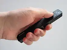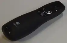 A wireless clicker [1] or wireless presenter [2] is a handset remote used to control a computer during a presentation, by emulating a "mouse click" + "some keys of a PC keyboard"; usually incorporating a laser pointer to pinpoint screen details. It is mainly used for presentations with a video projector or a big TV screen (for example a computer presentation created with PowerPoint, Impress or VCN ExecuVision), allowing the presenter to move freely in front of the audience.[3]