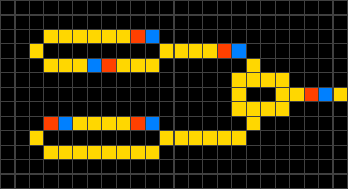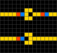 - conductor → electron head if exactly one or two of the neighbouring cells are electron heads, otherwise remains conductor.