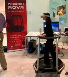 The ROVR consists of a round, concave, low friction platform and a plastic or metal frame for user support. The user slides their feet back and forward on the platform, in a reciprocating motion, to simulate locomotion whilst wearing shoe covers that are designed to reduce friction.[2] The soles of the shoe covers are coated in ceramic discs that reduce friction between the user's feet and the ROVR. ROVR Systems also sells shoes with ceramic discs already fitted.[3] A contact microphone in the ROVR's platform translates the sound of the user's feet moving into forward movement within virtual reality. A low level of noise, made by slow or small movements on the platform, becomes slow movement in virtual reality, whilst louder noises increase the speed of movement.[4] The user moves in whichever direction the head or hand controllers are facing, as the acoustic sensor system can not detect the movement direction of the feet or the orientation of the body.[5] The concave platform combined with reciprocating movement of the feet minimises vertical movement of a person's centre of mass and so mimics the best low energy movement of real walking. It also encourages the user's feet to slip back into the centre of the ROVR, stopping the user from moving off the platform. A ring encircles the user at waist height, forming a containment field. This is for user support during orientation and to provide a boundary to stop the user from moving off the platform. Users quickly become used to the platform's surface, and are able to balance without the help of the ring, their hands being free to use independent controllers such as Oculus Touch, Vive wands, Knuckles and the Xbox One Controller.