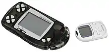 The main CPU of the WonderSwan is a 16-bit NEC V30 MZ, a variant of the Intel 8086.[16][17] The original model's screen is capable of displaying up to eight shades of gray, in contrast to the four displayed by the WonderSwan's main competitor, the Game Boy. Similar to the Atari Lynx, the handheld has an extra set of buttons allowing the console to be played at different angles; for the WonderSwan, these buttons were used to allow gamers to play games in both the portrait and landscape orientations. The WonderSwan series are all powered by a single AA battery, with the original monochrome version having a battery life of 40 hours.[7] It also allows players to record their personal information, such as their name, birth date, and blood type, which then can be accessed and used by the game.[18] Its LCD screen is 2.49 inches (6.3 cm) and displays at a resolution of 224 × 144.[6] Its sound capabilities consist of four PCM channels, each of which can play 32-sample, 4-bit sounds at selectable volume and pitch levels.[19]