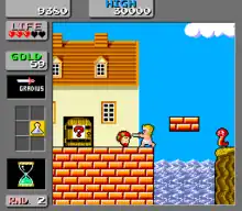 In the Master System version of the game, pressing the pause button on the console takes players to the Status Screen which primarily shows what items they currently have. Other information displayed in the Status Screen include types and strengths of weapons and armor equipped; gold; life remaining; special items collected; and types of "Magic Weapons" collected and their quantities.[14] Magic Weapons include bombs that roll on the ground, fireballs that fly through the air, small tornadoes that run on the ground and attack enemies, and "thunder flash" which damages all enemies on the screen.[15] In the game's other versions except for Famicom version, all gameplay information is displayed on the left and top edges of the screen; there is no need to access a separate screen.[7][16]