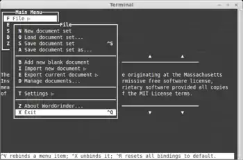 WordGrinder is a word processing application for the unix terminal or Windows console.[2][3] Wordgrinder focuses on creating a minimalist word processing environment in order to reduce distractions for the end user. The application's author wrote the program for his own use while working on a novel.[4] Files are saved in a text-based file format that includes options and styles with the document (versions prior to v0.7 used a binary file format instead of plain text).[5]