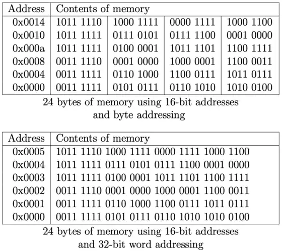 Consider a computer which provides 524,288 (219) bits of memory. If that memory is arranged in a byte-addressable flat address space using 8-bit bytes, then there are 65,536 (216) valid addresses, from 0 to 65,535, each denoting an independent 8 bits of memory. If instead it is arranged in a word-addressable flat address space using 32-bit words, then there are 16,384 (214) valid addresses, from 0 to 16,383, each denoting an independent 32 bits.
