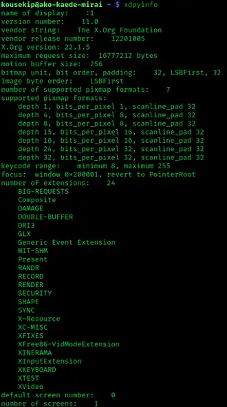 xdpyinfo, a command to show X.Org Server informationThe X.Org Server implements the server side of the X Window System core protocol version 11 (X11) and extensions to it, e.g. RandR.[7]