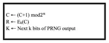 Yarrow-160 uses three-key Triple DES in counter mode to generate outputs. C is an n-bit counter value; K is the key. In order to generate the next output block, Yarrow follows the functions shown here.