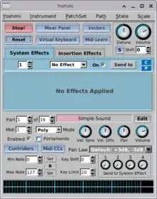 Yoshimi is an open-source software synthesizer for Linux.[2][3][4] It contains three synthesis engines, using additive, subtractive and wavetable synthesis (AddSynth, SubSynth, and PADSynth, respectively). Any single patch can use one or all. A kit mode allows a patch to have up to 16 of engine sets to support multi-layered sounds/drum kits. A complete setup or instance can contain anywhere from one to sixty-four patches.