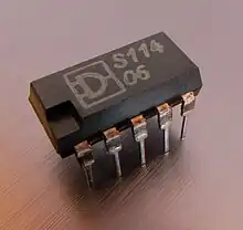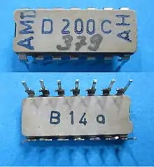 The company was founded in 1961 in Dresden under the leadership of Werner Hartmann as a research institute with the goal of developing technologies for manufacturing integrated circuits, following the seminal patents by Jack Kilby and Robert Noyce two years earlier.[1] Initially, it was named Arbeitsstelle für Molekularelektronik (Department of Molecular Electronics) and reported to the government's Office of Nuclear Research and Technology. In 1965 the institute was moved to the combine VVB Bauelemente und Vakuumtechnik which was responsible for manufacturing almost all electronic components in East Germany at the time. The researchers manufactured their first p–n junction in 1966, their first fully working bipolar junction transistor in 1967, and their first integrated circuit C10 (a four-input NAND gate with 7 transistors) in a 20 μm process and with a yield of 16% in April 1968.[1] Later that year in September the test chip C30 (two four-input NAND gates, 14 transistors, equivalent to the 7400 series 7420, 10 μm process) achieved a yield of 30%.[1] Under the designation D120C this design was later transferred for volume production to Halbleiterwerk Frankfurt (Oder) and publicly announced at the Leipzig Trade Fair in the spring of 1971, together with subsequent chips in the 7400 and 74H00 series.[2]