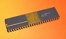 The development of dynamic RAM at ZMD continued with the 16-kilobit U256 and the 64-kbit U2164. First laboratory samples of the U2164 were obtained in 1981.[9] In 1984 the U2164 was presented at the Leipzig Spring Fair.[10] Pilot production at ZMD started in 1986.[9] In 1988 mass production of the U2164 began at VEB Mikroelektronik "Karl Marx" Erfurt.[9] For comparison, internationally 64-kbit chips became available commercially around 1980.[9] The pilot production of the 256-kbit U61256 started in 1988, and the 1-Mbit U61000 followed in 1989.[9] Neither of those two could be transferred to mass production until German Reunification in 1990.[11] About 35,000 U61000 were manufactured in 1988 and 1989.[11] Production of the U61256 suffered from an industrial accident in July 1989 and the yield dropped from an already low 6.1% to below 1%.[9] The development of the megabit chip U61000 was much publicized at the time as proof of the capability of East German industry and the socialist system in general. Kombinat Carl Zeiss Jena used the U61000 to advertise its semiconductor manufacturing equipment. For this reason the U61000 bore the Carl Zeiss Jena logo while most other integrated circuits from ZMD kept the previous ZFTM logo.