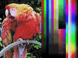 The image size of the framebuffer is 256x192 pixels, with a palette of 15 non-modifiable colours, where the entire colour palette is extremely saturated. The resolution of the colour output is 64 times lower than the resolution of the pixel bitmap.[1][2] The extremely low colour resolution was used to conserve memory, totaling just 768 bytes for colour attributes. Colour is stored separate from the pixel bitmap, as a 32x24 cell grid, using one byte per each of the character cells. One character cell is composed of 8x8 pixels. In practice, this means any character cell can only use two selected colours for colouring the contained 64 pixels.[3]