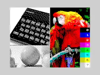 - Pixels: 256 x 192; 512 x 192 (Hi-Res mode)