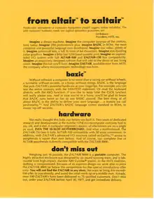 As a joke, Wozniak decided to print a "20,000 brochures" (according to YouTube video "Rare video of Steve Wozniak from 1984 talking about computing, joining Apple and the Mac" filmed at a Cleveland computer club meeting) of a fake product called the 'Zaltair' with a lot of "superlative descriptions of a computer that solved every problem in the world".[1] It advertised, among other things, a new version of the BASIC programming language called "BAZIC", with the ability to "define your own language... a feature we call perZonality".[2]