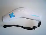 The Boomerang, sold by Tectoy in Brazil, is a wireless controller with a built-in accelerometer, using motion-sensing technology to play games with actual physical gestures.[41] It has a D-Pad, two buttons (labeled 1–2) on the top-left side, a "Home" button, a sliding on-off switch and a wrist strap. It requires two AA batteries as a power supply.