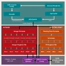 Each Zen core can decode four instructions per clock cycle and includes a micro-op cache which feeds two schedulers, one each for the integer and floating point segments.[42][43] Each core has two address generation units, four integer units, and four floating point units. Two of the floating point units are adders, and two are multiply-adders. However, using multiply-add-operations may prevent simultaneous add operation in one of the adder units.[44] There are also improvements in the branch predictor. The L1 cache size is 64 KB for instructions per core and 32 KB for data per core. The L2 cache size 512 KB per core, and the L3 is 1–2 MB per core. L3 caches offer 5× the bandwidth of previous AMD designs.