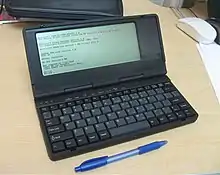 Manufactured around 1991–1992 and selling for $595, the Zeos Pocket PC was a palmtop which ran MS-DOS 5.0 and was broadly similar in form and function to the Poqet PC. The device was also available as Tidalwave PS-1000, Vobis Highscreen Handy Organizer, and Peacock Palmtop PC in other countries.[6] It was bundled with Microsoft Works and RacePen. Its dimensions were 4.5" × 9.7" × 1.0" and it weighed approximately 1.3 lb (0.59 kg). The 640x200 monochrome LCD screen was about 2.75" × 7" and was not backlit. The keyboard was 9" wide (compared to 11" for a standard keyboard), making typing slightly tedious for many people. The unit featured two PCMCIA card slots, as well as a serial and a parallel port located on the rear which used proprietary mini-connectors and custom cables, which were included with the unit. The unit powered on instantly using two standard AA batteries and one lithium backup battery. It was manufactured in Taiwan and sold by mail-order.