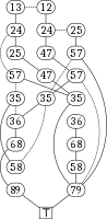 These paths can be represented by the ZDD shown in Figure 13, in which each node mn represents the question "does the path include the arc between m and n?" So, for example, the LO branch between 13 and 12 indicates that if the path does not include the arc from 1 to 3, the next thing to ask is if it includes the arc from 1 to 2. The absence of a LO branch leaving node 12 indicates that any path that does not go from 1 to 3 must therefore go from 1 to 2. (The next question to ask would be about the arc between 2 and 4.) In this ZDD, we get the first path in Figure 12 by taking the HI branches at nodes 13, 36, 68, and 89 of the ZDD (LO branches that simply go to ⊥ are omitted). Although the ZDD in Figure 13 may not seem significant by any means, the advantages of a ZDD become obvious as the grid gets larger. For example, for an eight by eight grid, the number of simple paths from corner to corner turns out to be 789,360,053,252 (Knuth). The paths can be illustrated with 33580 nodes using a ZDD.