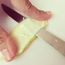 For culinary use, a zester, grater, vegetable peeler, paring knife, or even a surform tool is used to scrape or cut zest from the fruit. Alternatively, the peel is sliced, then excess pith (if any) cut away.