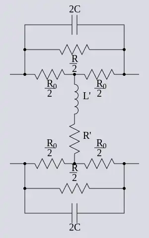 It is possible to transform a bridged–T section into a Lattice, or X–section (see Bartlett's bisection theorem).[2] The X–section is a kind of bridge circuit, but usually drawn as a lattice, hence the name. Its topology makes it intrinsically balanced but it is never used to implement the constant resistance filters of the kind described here because of the increased component count. The component count increase arises out of the transformation process rather than the balance. There is however, one common application for this topology, the lattice phase equaliser, which is also constant resistance and also invented by Zobel. This circuit differs from those described here in that the bridge circuit is not generally in the balanced condition.