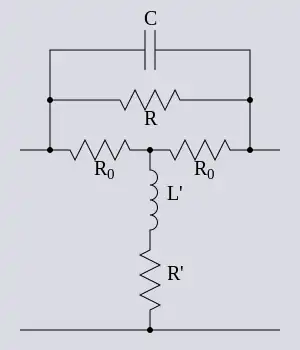 A Bode network, as with a Zobel network, is a symmetrical bridge T network which meets the constant k condition. It does not however meet the constant resistance condition, that is, the bridge is not in balance.[4] Any impedance network, Z, can be used in a Bode network, just as with a Zobel network, but the high pass section shown for correcting high-end frequencies is the most common. A Bode network terminated in a variable resistor can be used to produce a variable impedance at the input terminals of the network. A useful property of this network is that the input impedance can be made to vary from a capacitive impedance through a purely resistive impedance to an inductive impedance all by adjusting the single load potentiometer, RL. The bridging resistor, R0, is chosen to equal the nominal impedance so that in the special case when RL is set to R0 the network behaves as a Zobel network and Zin is also equal to R0.