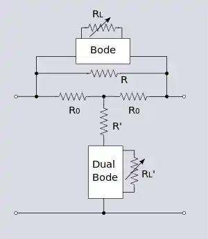 The Bode equaliser can be converted into a constant resistance filter by using the entire Bode network as the Z branch of a Zobel network, resulting in a rather complex network of bridge T networks embedded in a larger bridge T. It can be seen that this results in the same transfer function by noting that the transfer function of the Bode equaliser is identical to the transfer function of the general form of Zobel equaliser. Note that the dual of a constant resistance bridge T network is the identical network. The dual of a Bode network is therefore the same network except for the load resistance RL, which must be the inverse, RL', in the dual circuit. To adjust the equaliser RL and RL' must be ganged, or otherwise kept in step such that as RL increases RL' will decrease and vice versa.