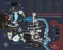 Zork is a text-based adventure game wherein the player explores the ruins of the Great Underground Empire. The player types text commands for their character to traverse locations, solve puzzles, and collect treasure. The game has hundreds of locations, each with a name and description, and the player's commands interact with the objects, obstacles, and creatures within them. Commands can be one or two words (e.g., "get lamp" or "north") or more complex phrases (e.g., "put the lamp and sword in the case"). The command must fit the location's context (e.g., "get lamp" works only if a lamp is present). The program acts as a narrator, describing to the player their location and the results of certain actions. If the game does not understand the player's commands, it asks for the player to retype their actions.[1][2][3] The program's replies are typically in a sarcastic, conversational tone, much as a Game Master would use in leading players in a tabletop role-playing game.[4]