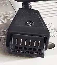 The SIO bus was implemented using a custom 13-pin D-connector arrangement (although not D-subminiature) with the male connectors on the devices and the female connectors on either end of the cables.[8] The connectors were physically robust to allow repeated use, with very strong pins in the device socket and sprung connectors in the cables, as opposed to friction fit as in a typical D-connector. Most devices had in and out ports to allow daisy chaining peripherals, although the Atari 410 Program Recorder had to be placed at the end of the chain and thus did not include an out port.