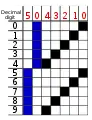 Bi-quinary coded decimal is a numeral encoding scheme used in many abacuses and in some early computers, including the Colossus.[2] The term bi-quinary indicates that the code comprises both a two-state (bi) and a five-state (quinary) component. The encoding resembles that used by many abacuses, with four beads indicating the five values either from 0 through 4 or from 5 through 9 and another bead indicating which of those ranges (which can alternatively be thought of as +5).