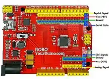 | Roboduino[100] | Designed for robotics. All connections have neighboring power buses (not pictured) for servos and sensors. Additional headers for power and serial communication are provided. It was developed by Curious Inventor, LLC. | |||||||||||||||||