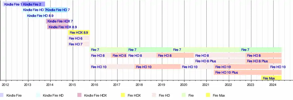 | 7" | Kindle Fire | Kindle Fire, Kindle Fire HD | Kindle Fire HD, Kindle Fire HDX Wi-Fi, Kindle Fire HDX WAN | Fire HD | Fire | Fire | Fire | Fire 7 | |||||||