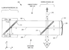 - Display: The Explorer version of Google Glass uses a liquid crystal on silicon (based on an LCoS chip from Himax), field-sequential color system, LED illuminated display.[37] The display's LED illumination is first P-polarized and then shines through the in-coupling polarizing beam splitter (PBS) to the LCoS panel. The panel reflects the light and alters it to S-polarization at active pixel sensor sites. The in-coupling PBS then reflects the S-polarized areas of light at 45° through the out-coupling beam splitter to a collimating reflector at the other end. Finally, the out-coupling beam splitter (which is a partially reflecting mirror, not a polarizing beam splitter) reflects the collimated light another 45° and into the wearer's eye.[38][39]