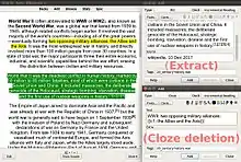 1. "History of incremental reading". Retrieved December 10, 2017. SuperMemo 99 made the first step towards efficient reading of electronic articles by introducing reading lists and the first primitive reading tools: extracts and clozes. Reading lists are prioritized lists of articles to read. Extracts make it possible to split larger articles into smaller portions. Clozes make it possible to convert short sentences into a question-answer format using cloze deletions.