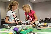 FIRST Lego League Challenge (founded as FIRST Lego League) is a robotics competition that uses Lego Mindstorms products.[lower-alpha 1] It was founded in 1998 concurrent with the launch of LEGO Mindstorms and continues to exist to this day. It is a collaboration between FIRST and The Lego Group to involve a lower age bracket than the FIRST Robotics Competition.[8] FLL teams consist of children between the ages of 9 and 14, and an adult coach.