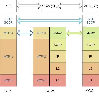 ________ _________ __________ | | | | | MGC| | SP |<----------------->| SGW |<---------------|-->(AS) | |______| SS7 network |_______| IP network |________| MTP3 point-code common point-code PC1 PC2