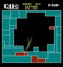 Qix[lower-alpha 1] (/ˈkɪks/ KIKS[lower-alpha 2]) is a 1981 puzzle video game developed by husband and wife team Randy and Sandy Pfeiffer and published in arcades by Taito America. Qix is one of a handful of games made by Taito's American division (another is Zoo Keeper).[4] At the start of each level, the playing field is a large, empty rectangle, containing the Qix, an abstract stick-like entity that performs graceful but unpredictable motions within the confines of the rectangle. The objective is to draw lines that close off parts of the rectangle to fill in a set amount of the playfield.