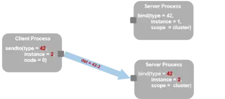 - Service Address. This address type consists of a 32-bit service type identifier and a 32-bit service instance identifier. The type identifier is typically determined and hard coded by the user application programmer, but its value may have to be coordinated with other applications which might be present in the same cluster. The instance identifier is often calculated by the program, based on application specific criteria.